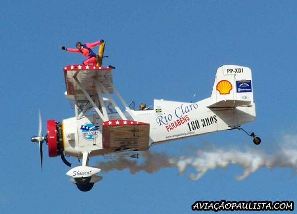 A wingwalker Marta Lucia Bognar voando na asa do Grumman Showcat, PP-XDI, pilotado pelo Pedrinho Melo. |